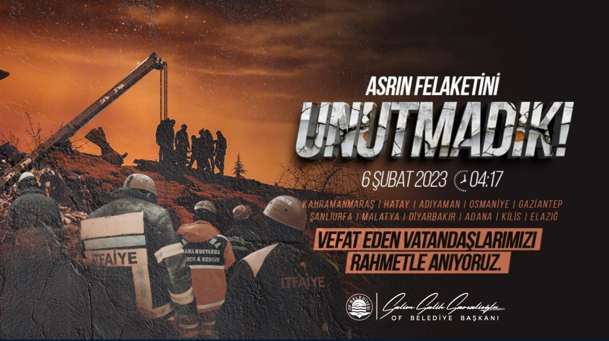 Of Belediye Başkanı Salim Salih Sarıalioğlu, 6 Şubat 2023 depremlerinin 3'üncü yıl dönümü dolayısıyla yayımladığı mesajda, asrın felaketinde hayatını kaybeden vatandaşları rahmetle anarak, depremzedelerin acısını Of halkı olarak ilk günkü hassasiyetle yüreklerinde taşıdıklarını vurguladı.