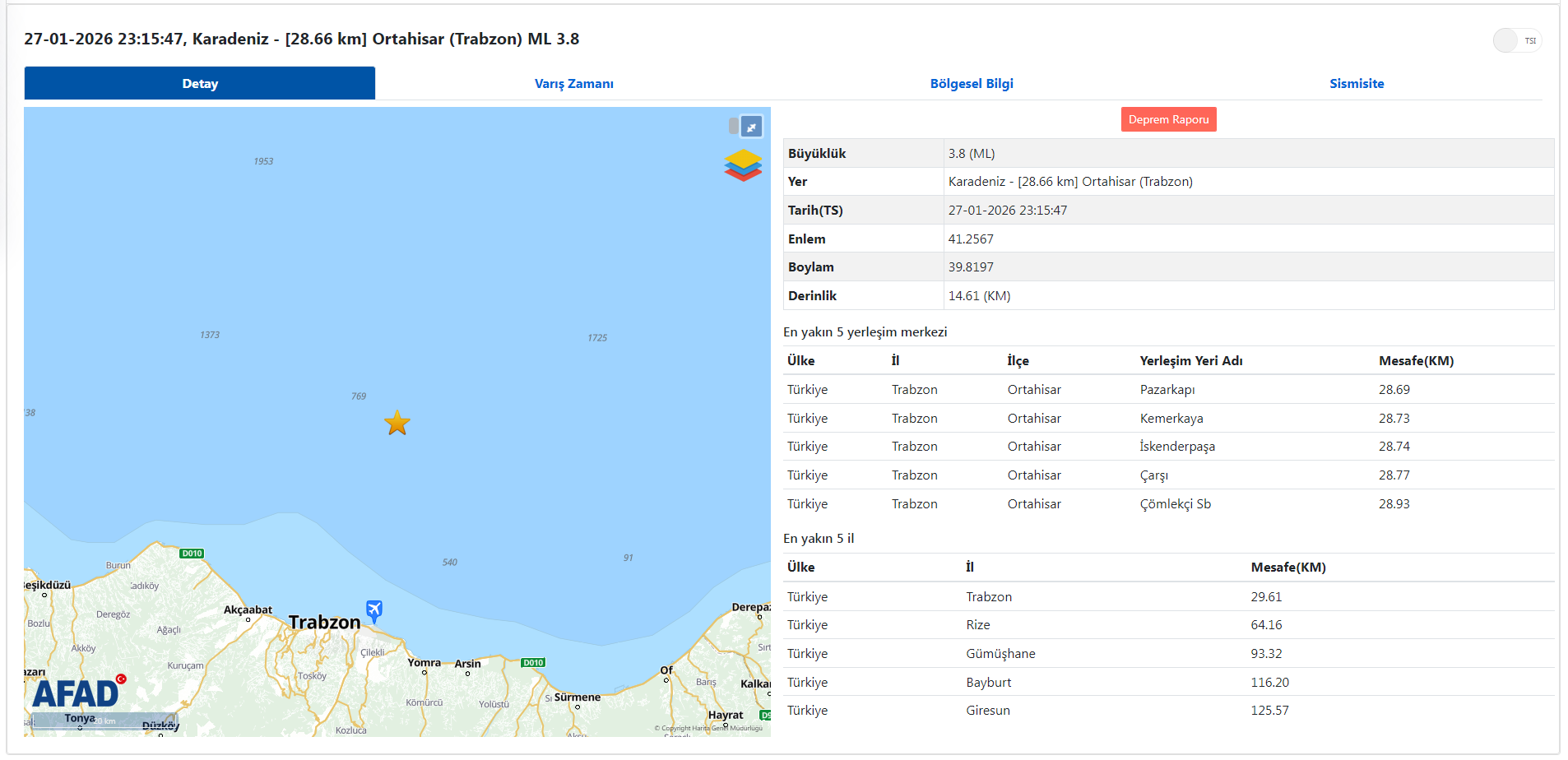 AFAD Deprem Dairesi'nden yapılan açıklamaya göre, deprem saat 23:15:47'de Karadeniz'de Ortahisar açıklarında meydana geldi. Depremin merkez üssü Ortahisar'a 28.66 km uzaklıkta, derinliği ise 14.61 km olarak kaydedildi.